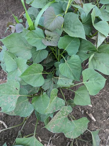 The plant habit is vining. Leaf color is green with a few leaves having a purplish tint. Leaf shape is mostly cordate with some triangular leaves, and the leaves have up to 3 points.