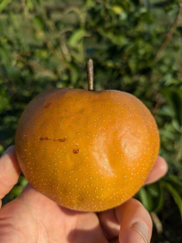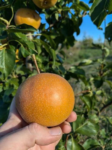 Shinko is an asian type pear that was introduced in Japan in 1941. It's a sweet, crunchy, super juicy pear. Probably the juiciest pear that we grow. Shinko translates to "New Success" and it is a cross of the Nijisseiki and Amanogawa varieties.